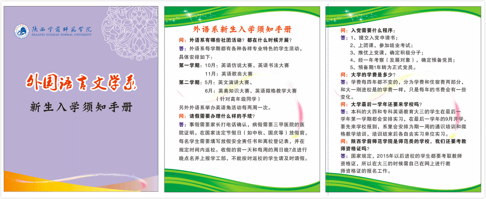 《新生入学须知手册》由系学生辅导员共同商定内容,涵盖学生从大一到毕业需要完成的主要事项,包括贫困认定及奖助学金评定、各项社团活动、英语等级证书、教师资格证书、毕业相关事宜等。手册的外观设计新颖,内容翔实丰富,层次清晰。该手册为初入大学校园的新生明确了各项重要事项的时间节点,为他们按时完成大学学习任务、做好学业规划、制定发展目标、合理支配时间提供了依据。