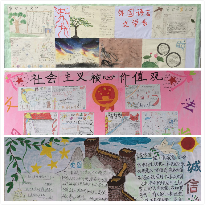 继《新生入学须知手册》制作及发放之后,近期外国语言文学系又开展了“新生入学教育手绘展板”工作。展板制作由16级各班文体委员组织本班同学进行,以手抄报的形式展开,内容围绕新生入学教育的核心思想进行,包括:诚信、感恩、文明、法治等社会主义核心价值观的教育;宿舍用电安全、传染病知识及用餐安全、人身财产安全、信息物流安全等安全教育及适应大学、认识大学的各项教育。 学生参与手抄报的绘制过程使他们切身感受到了社会主义核心价值观的潜移默化及安全的重要性,对大学生形成独立人格、完善道德修养、规划大学生涯及自身的成长成才打下了良好的基础。