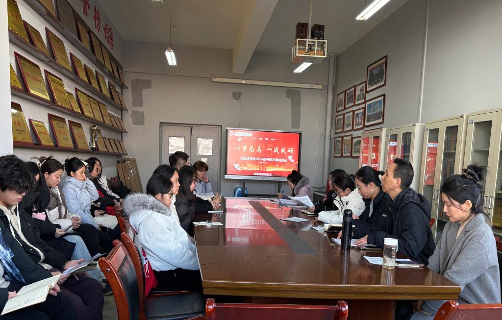 随着全国硕士研究生招生考试进入最后的关键阶段,为坚定学子信念,鼓舞拼搏士气,外国语学院于12月15日下午在学院会议室隆重而热烈的氛围中,成功举办了以“以梦为马,一战成硕”为主题的2026届毕业生考研冲刺动员大会。院长张莉娟、书记高海燕、副院长刘少杰、副书记侯文彬,教师代表温宏社、李娟及毕业班辅导员参加了大会,考研学子代表、大三学生代表齐聚一堂,共同吹响了向梦想发起最后总攻的号角。