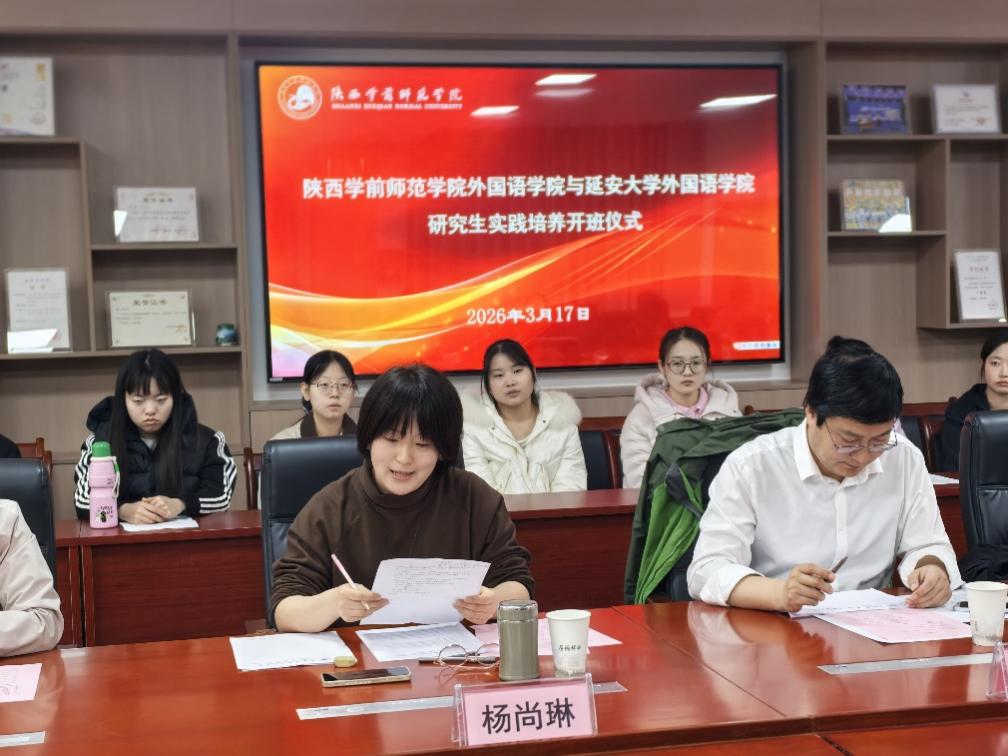 2026 年 3 月 17 日下午,陕西学前师范学院与延安大学研究生实践培养签约暨开班仪式在行政楼第五会议室顺利举行。李明军副校长,学科建设与科研处、外国语学院及数学与统计学院负责人,延安大学相关学院负责人、硕士生导师代表、实践基地实践工作负责人及全体联合培养研究生共同参会。开班仪式由外国语学院负责人主持。