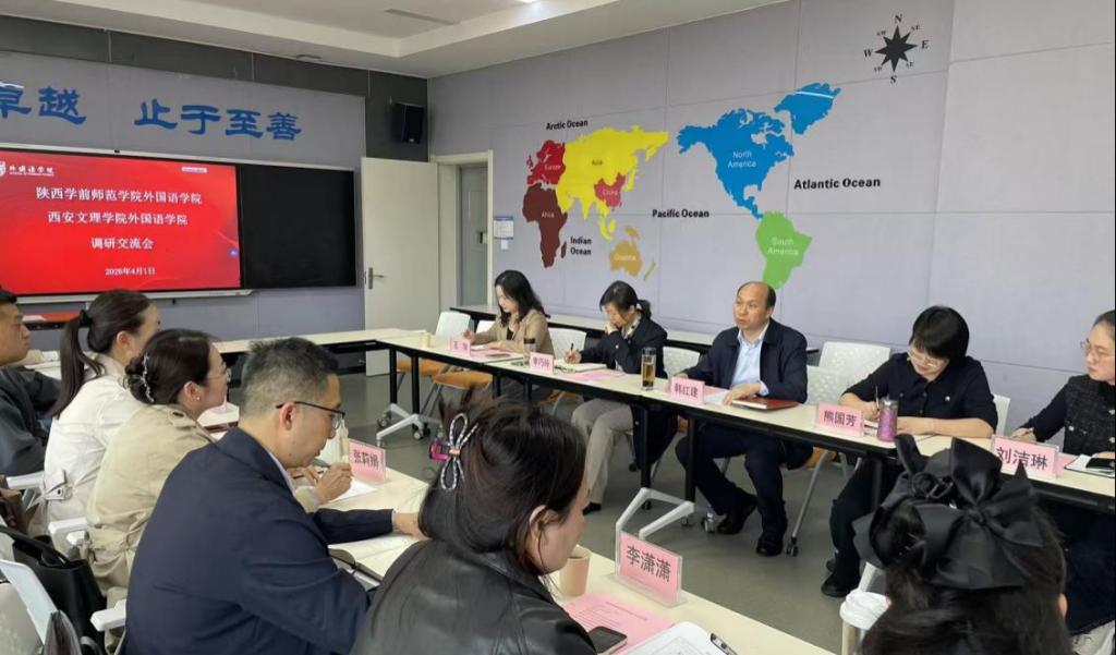 2026年4月1日下午,外国语学院院长张莉娟一行10人前往西安文理学院外国语学院,开展学科专业建设与人才培养专题调研。西安文理学院外国语学院院长韩红建、副院长熊国芳、副书记李巧玲及相关系部主任热情接待。双方围绕专业认证背景下的英语专业建设、复合型翻译人才培养、课程体系优化、大学英语教学改革、学生活动与竞赛组织等议题展开了深入交流。
